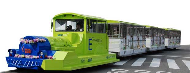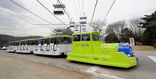 The OLEV developed by the Korea Advanced Institute of Science and Technology (KAIST) is charged wirelessly over a 400-meter long stretch of electrical strip and runs an additional 400 meters on the charged battery. The special electrical strip creates a magnetic field that generates magnetic force. The magnetic force is sent wirelessly to the vehicle and converted into electricity, which is then used to power the vehicle. At the Seoul Grand Park, the OLEV will service a 2.2 kilometer-long circular route.