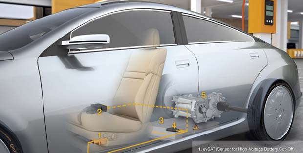 The evSAT sensor employs an algorithm to detect a frontal, rear or side collision with another vehicle and immediately transmits a signal via the CAN interface to the battery management system which then switches off the battery within half a second.