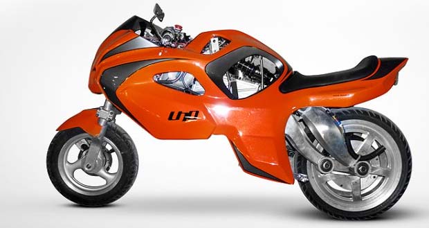 Uno III has three wheels. It rides on its two rear wheels like a Segway at low speeds and then transforms into a more conventional full street bike at higher speeds. A third wheel moves forward at the press of a button.