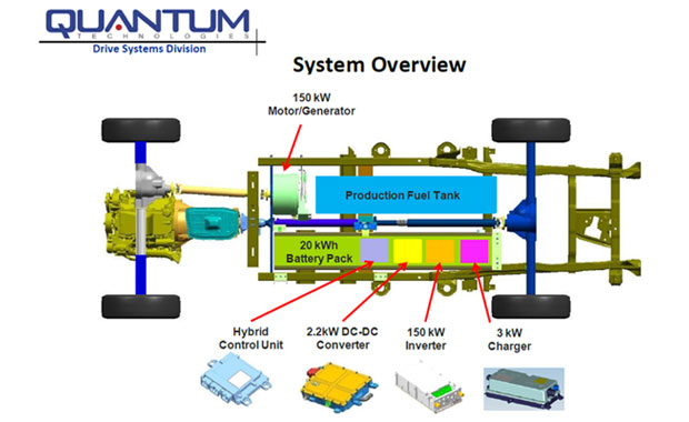 The Quantum “F-Drive” hybrid system is available in 2WD and 4WD versions. To meet the requirements of fleet customers, the F-Drive has been integrated in the F150 vehicle such that there is no impingement into the cab or bed and it maintains full ground clearance.