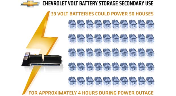 GM and ABB estimate that, during an outage or brownout, 33 recycled Volt batteries will have enough storage capacity to power up to 50 homes for about four hours. Over time, batteries lose their storage capacity. After seven to 10 years, their storage capacity decreases to about 70% of what they had when new. Furthermore, the batteries are the most expensive component of plug-in electric vehicles. These tired batteries are still suitable for grid storage.