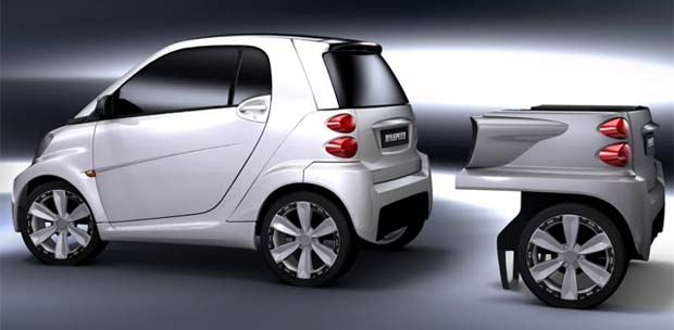Based on a smart fortwo electric drive, the Dock+Go comes with an attachable rear trailer complete with its own set of wheels. It holds an energy pack with a combustion engine/range extender, thus being able to substantially increase driving range.