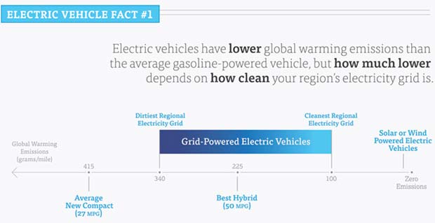 – Nationwide, EVs charged from the electricity grid produce lower global warming emissions than the average compact gasoline-powered vehicle (with a fuel economy of 27 miles per gallon)—even when the electricity is produced primarily from coal in regions with the “dirtiest” electricity grids.