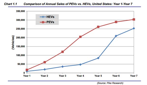 for PEV product introductions for the remainder of 2012, Pike Research forecasts the global PEV market will reach 137,950 units in 2012.  U.S. PEV sales will reach 47,966 units, making the United States the country with the highest number of PEV sales. The country will maintain this lead role at least through 2020 – and beyond. Of those nearly 48,000 sales in the United States, 27,992 will be PHEVs and 19,974 will be BEVs in 2012.