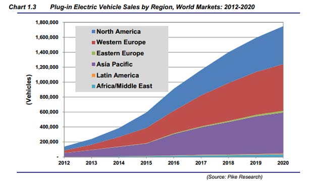 Western Europe will fall somewhere in between, showing  roughly equal sales numbers for both PHEVs and BEVs.  In the mid-term, the three global regions, North America, Asia Pacific, and Western Europe, will each represent roughly one-third of the PEV market. As China’s PEV market begins to grow in 2013 and expands throughout the decade, Asia Pacific will become the world’s largest market for PEVs.