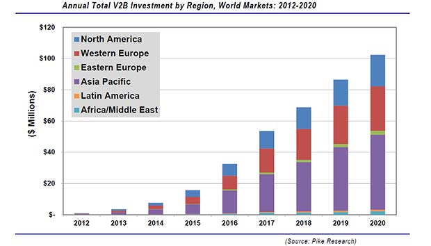 Pike Research forecasts that annual investments in upgrades to vehicles and to buildings, which include power electronics, inverters, and power management software, will grow to more than $76 million worldwide, annually, by 2020. Vehicle investment to enable V2B will be about $27 million worldwide annually by then.