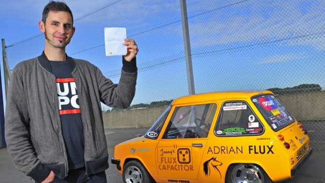 He dubbed the car the Flux Capacitor with the idea of going Back to the Future of the electric car, and as a nod to the sponsor, insurance broker Adrian Flux.