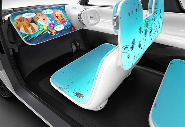 Teatro for Dayz’s plain exterior, too, serves as a canvas for ideas. It’s outfitted with LED screens that enable further self-expression. Any experience in or around the car can be shared instantly via an onboard camera. All the while, the EV battery keeps smartphones and other devices juiced up.