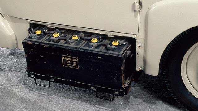 The battery compartment was in the cabin floor of the Tama electric car. There were two such compartments, one on either side. Each battery case was provided with rollers so that used batteries could be quickly exchanged with freshly charged ones. Thanks to such engineering, the Tama took top honors in the performance tests conducted by the Ministry of Commerce and Industry in 1948.