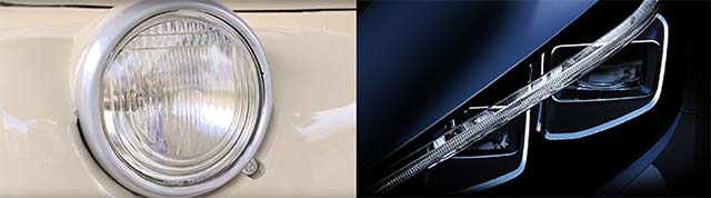 How times have changed: The 1947 Tama headlight, left, advanced for its day, looks so simple compared to the modern lighting of the upcoming next-generation Nissan LEAF.