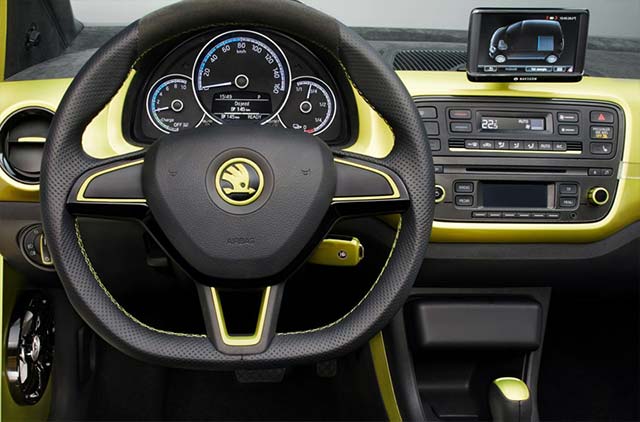 The silver-coloured underbody protection at the front and rear as well as the black/yellow 16-inch SCORPIUS alloy wheels with all-terrain tyres are particularly striking. The high wheel arches are framed by a black trim which continues along the bottom edge of the sills between the wheels, creating a narrow running board. There are no doors; you just climb over the side sills decorated with aluminium checker-plate strips and slide into the sports bucket seats. The rear lights feature LED technology. The SKODA students also considered the smaller details, with the car’s yellow (Dragon Skin) brake callipers, demonstrating their attention to detail.