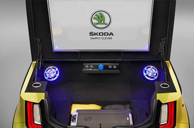 There is also a Navigon navigation system on board, which – fitted in a separate bracket – seems to float above the air conditioning controls. The car’s most striking feature, however, can be found where the SKODA CITIGO has its back seats. The students fitted a solar panel as well as a Smart TV behind the front seats which can be paired with a smartphone via Bluetooth. The Smart TV is located in the aluminium-decorated boot lid to which the solar panel has been mounted, sitting between two rustic, matt-black brackets. One speaker next to each seat and two additional speakers fitted in the boot turn the SKODA ELEMENT into a 400-watt beach club on wheels. The students have also integrated a cool box into the boot that is classily lined with blue carpet. The cool box is connected to an additional battery and powered by the solar panel.
