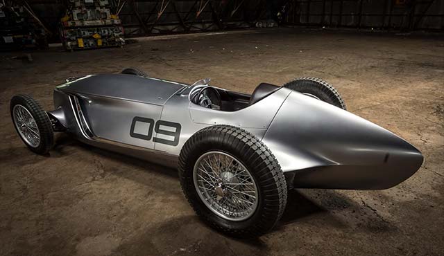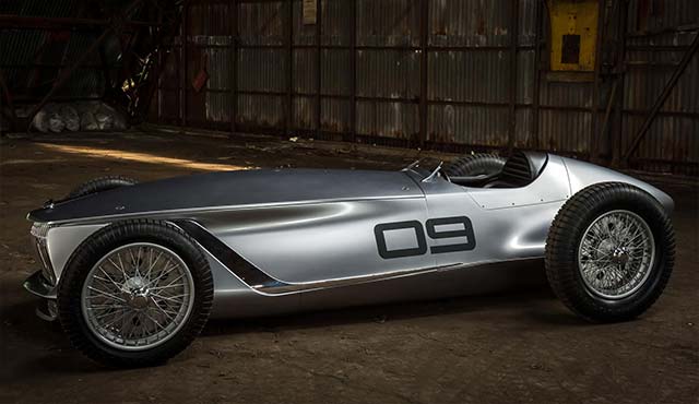 In every other respect, the car is unashamedly inspired by retro aeronautical designs. Prototype 9 is defined by its smooth, aerodynamic surfaces, long bonnet and short overhangs, an exposed cockpit, and open-wheeled layout. 19-inch centre-locking wire-spoke wheels at each corner are even wrapped in period cross-ply competition tyres.