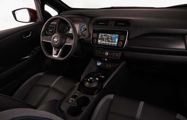 The interior design creates a relaxed ambience and premium quality feel, due to the carefully selected materials. Vibrant blue stitching in the seats, instrument panel and steering wheel have been incorporated as a symbol of Nissan’s electric vehicles. The 7-inch, full-color TFT display has been redesigned for easier comprehension of key features, such as the Safety Shield technology, power gauge and audio and navigation system information. Apple CarPlay and Android Auto have also been added.