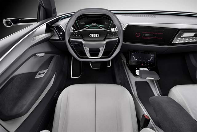 23-inch wheels in a technical 6-spoke design highlight the confident presence of the SUV coupe. An exterior length of 4.90 meters (16.1 ft), a width of 1.98 meters (6.5 ft) and a height of 1.53 meters (5.0 ft) with a wheelbase of 2.93 meters (9.6 ft) position the Audi Elaine in the C segment, close to the Audi A7. The interior is bright and designed for simplicity. Functions are clearly structured, the number of control elements vastly reduced. Expansive touchscreens below the central display, on the center console and in the door trims supply information and interact with the on-board systems. Horizontal surfaces on the dashboard and the seemingly floating center console convey a sense of open perspectives for the four passengers in their individual seats.