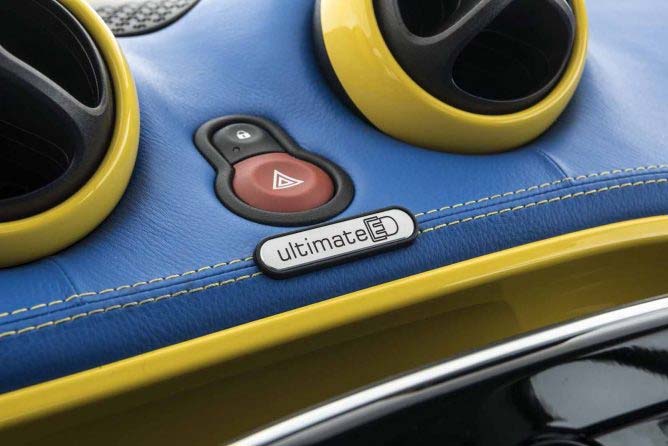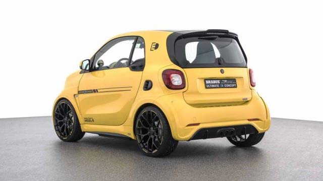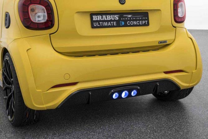 150 kW / 204 HP (201 bhp), 350 Nm (258 lb-ft) of torque, 0 – 100 km/h in 4.5 seconds and a top speed of 180 km/h (112 mph). A strikingly styled bright yellow body running on 18-inch forged wheels, and a luxurious interior crafted from the finest blue leather: On the occasion of the 40th anniversary of BRABUS the BRABUS ULTIMATE E Concept celebrates its world premiere at the IAA 2017 in Frankfurt am Main.