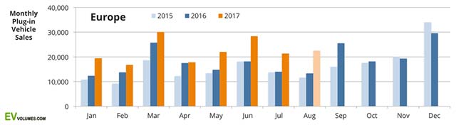 In total, Europe plug-in sales grew by 32 %, compared to 2017-H1. Q1 increased 28%, Q2 35%. The preliminary results for July and August indicate that growth is accelerating: July came in + 54 %, August + 69 %, compared to the same months of last year.