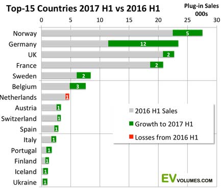Nearly all Europe markets showed growth during H1-2017, only Netherlands‘ buyers still struggle with the incentive shift from Plug-in Hybrids to pure-electric vehicles. France and UK sales show only moderate increases for the first half year; all others have double or triple digit growth during the period, albeit from smaller bases.