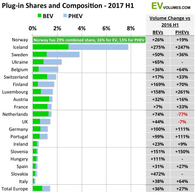 The plug-in share in Norway is off the chart, as usual, and still growing. No other country comes close to the 29 % share which Noway has performed during this year. The peak month, so far, was June with 35 %. BEV share was 16 %, PHEV share was 13 % for 2017 H1. EVs have a long tradition in Norway (think Th!nk and Buddy) and EV adoption in Norway started some years ahead of other countries. Thanks to obvious, stable incentives in form of generous tax and toll savings, EVs have become normality for light duty transport, despite long distances and a less than balmy climate. Cheap electricity from 99 % hydropower helps, too.