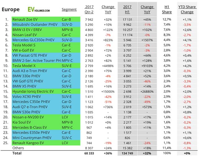 The best seller of 2016, Renault Zoe, increased another 32 % in Q2 and 45 % for the first half of 2017. The Zoe is on the market since 5 years now and much of the recent success can be attributed to the availability of a longer e-range version. A 41 kWh battery gives 400 km e-range by NEDC standards, which is more like 300 km under real conditions, but still. No other EV offers more range for a price starting of e.g. €26 000 in Germany. Over 50 % of Zoes are sold in France, where it costs even less.