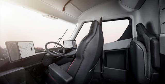The cab also has two touchscreen displays—again a Model 3 screen—positioned on both sides of the driver. The touchscreens provide all the information a driver needs and even double as side-view mirrors. The Tesla semi has built-in connectivity that integrates directly with a fleet’s management system to support routing and scheduling, and remote monitoring, according to the company.