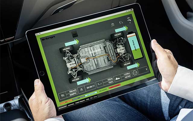 The recuperation system contributes to up to 30 percent of the electric SUV’s range. It involves both the two electric motors and the electrohydraulically integrated brake control system. For the first time, three different recuperation modes are combined: manual coasting recuperation using the shift paddles, automatic coasting recuperation via the predictive efficiency assist, and brake recuperation with smooth transition between electric and hydraulic deceleration. Up to 0.3 g, the Audi e-tron prototype recuperates energy solely via the electric motors, without using the conventional brake – that covers over 90 percent of all decelerations. As a result, energy is fed back to the battery in practically all normal braking maneuvers.