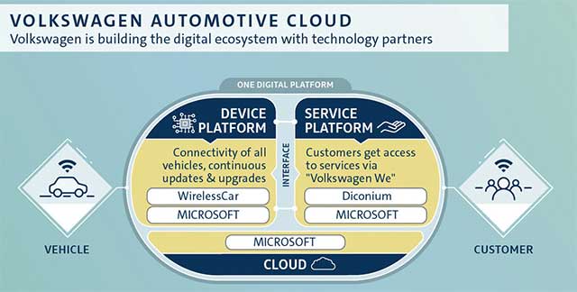 Volkswagen is developing the cloud-based platform together with Microsoft, and designing a customizable marketing platform (service platform) for all digital services with diconium. More specifically, WirelessCar technology will enable safe and stable data exchange between the vehicle’s operating system and the cloud-based platform, and forming an essential basis for the future software architecture in the vehicle (Device Platform).