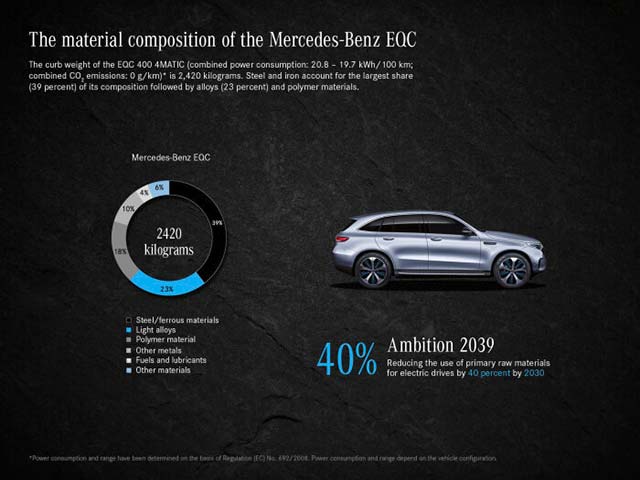 In production, the drive components specific to the EQC require a greater use of material and energy resources compared to a conventionally powered vehicle. The proportion of steel and iron is reduced by the omission of a combustion engine and transmission plus their peripheral units. On the other hand, the proportion of polymers, light alloys and other metals is increased.
