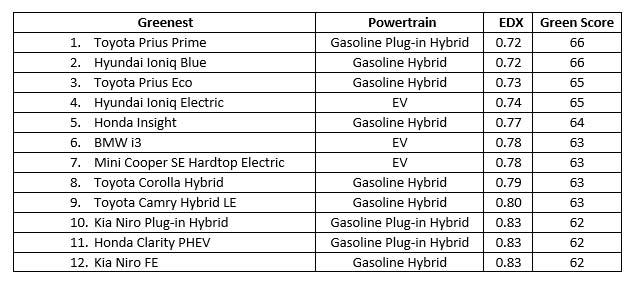 Hybrids Surge onto 2020 Greenest Car List, Joining the Greenest of EVs