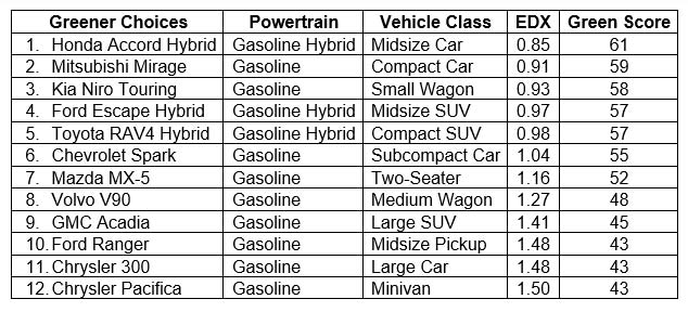 The Greener Choices list includes conventional vehicles and traditional hybrids, but excludes plug-in hybrids and pure battery EVs given the limited availability of charging stations.