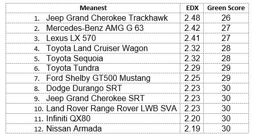 The Meanest List, as usual made up of gasoline-powered large SUVs, pickup trucks, and European luxury cars that are the least friendly to the environment. The Jeep Grand Cherokee Trackhawk takes the first (or last) position for a second year, with the rest of the list populated by regulars from prior years.
