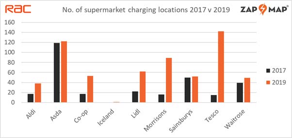 The RAC and Zap-Map have both long advocated the importance of supermarkets offering customers charging facilities due to the fact that customers spend 45 minutes on average in their stores – a more than reasonable amount of time to top up an electric car.