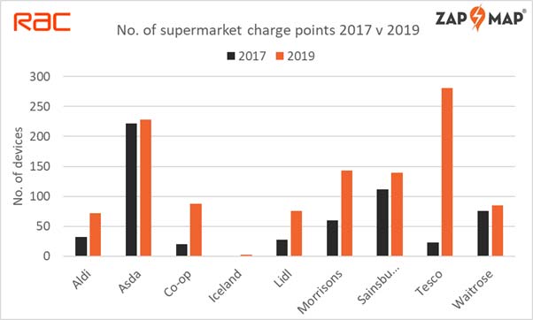 The number of EV charging points at supermarkets has doubled in the last two years, according to data analysed by Zap-Map and the RAC.