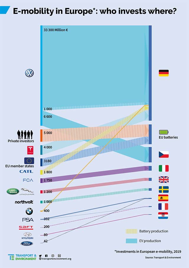Driven by EU car CO2 targets, industry and governments committed 3.5 times more into EV and battery production in Europe than they did in China, according to T&E’s report.