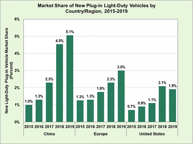 In that same five-year timeframe, market share of plug-in vehicles in China more than quadrupled, reaching 5.1% in 2019.