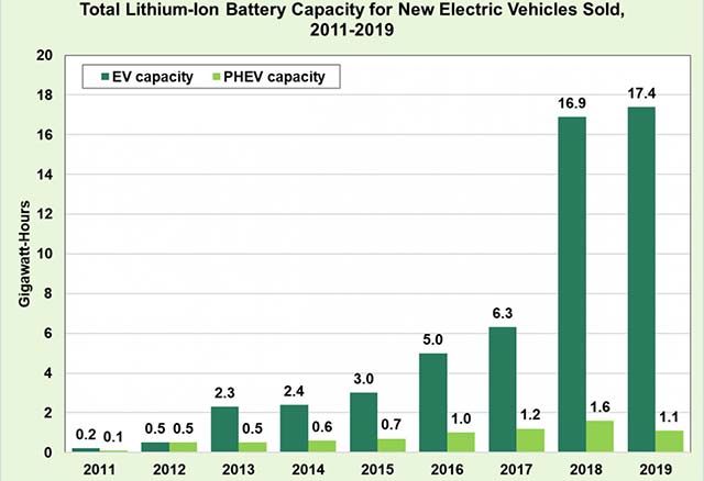 With a 1% increase in sales and increasing battery pack size, all-electric vehicles captured a record amount of total plug-in vehicle battery capacity sold in 2019, 17.4 gigawatt-hours.