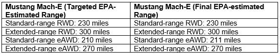 Ford has met all its targeted EPA-estimated range ratings for variants tested by the EPA to date. The premium extended-range rear-wheel-drive Mustang Mach-E meets its targeted EPA-estimated range of 300 miles, while the extended-range all-wheel-drive model meets its targeted EPA-estimated 270-mile range.