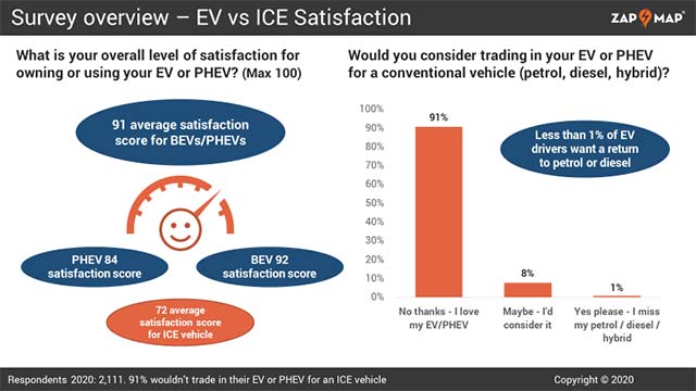 A new poll of Zap-Map’s community of electric vehicle drivers has revealed more than 90% of drivers will not be replacing their current EV with a petrol and diesel vehicle.