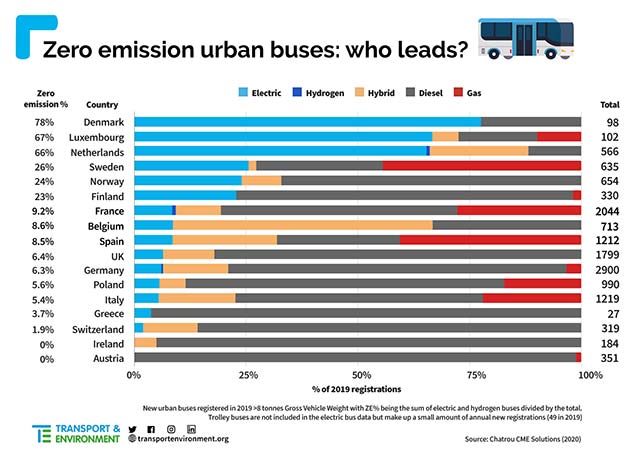 In Sweden, Norway and Finland, respectively 26%, 24%, and 23% of urban buses registered in 2019 were zero-emission (electric or hydrogen). Worryingly, Italy, Poland, Germany, the UK, Spain and France, which buy 70% of the urban buses sold in Europe, lag behind. In 2019, less than 10% of their newly-registered urban buses were electric or hydrogen.