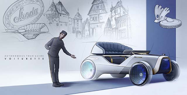 The first design takes inspiration from the brand’s first-ever production car, the Voiturette A. Created by Yuhan Zhang – a member of the interior design team at SKODA – the VOITURETTE study is an open-top two-seater carriage designed for use as a fully autonomous tourist car for the streets of Prague.