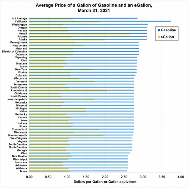 The state of Washington had the greatest difference in gasoline versus electricity costs, with $3.13 per gallon of regular gasoline and $0.89 per eGallon, which yields a fuel cost savings of about 72% for EV drivers.