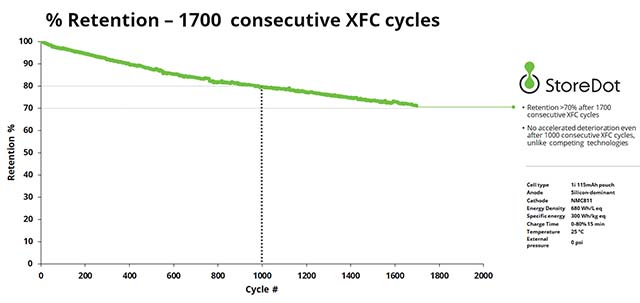 A robust performance is maintained even after 1000 cycles and 80% capacity, the point at which rival lithium-ion fast charging technologies start to rapidly deteriorate in performance. Even after 1700 cycles, long after the accepted industry norm, StoreDot’s batteries maintain 70% of the original capacity, making them highly effective in second life usage for less dynamic applications such as in energy storage and grid load balancing systems.
