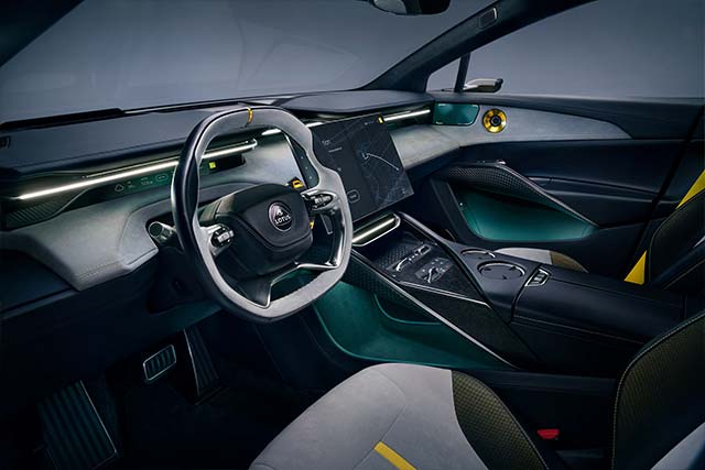 The driver-focused cockpit and high centre console are inspired by the Lotus Emira and Evija, creating a cossetted feeling. The layering of materials and textures creates a truly premium feel, augmented by a triangular theme – seen externally on the car’s active front grille – replicated in multiple locations around the cabin.