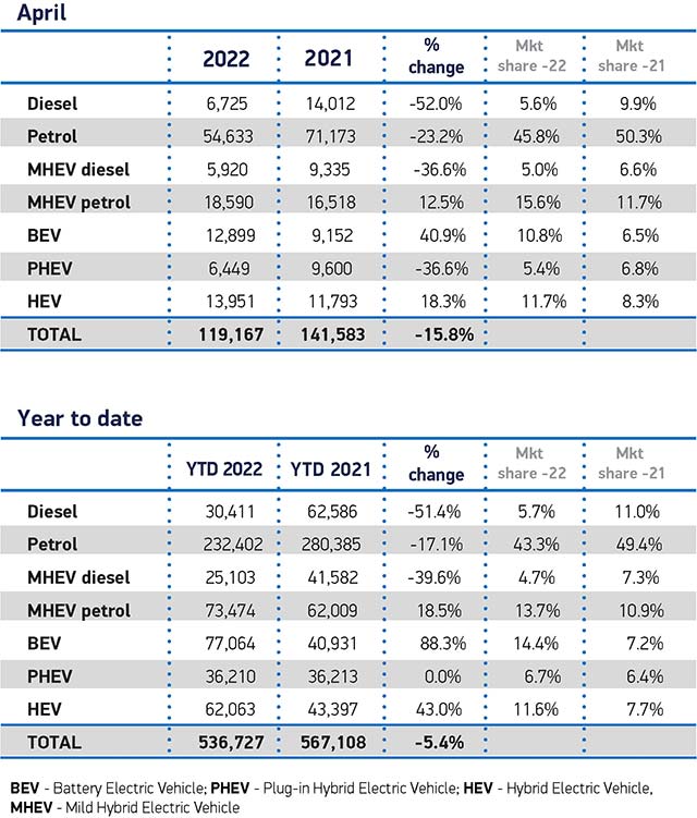UK new car registrations fell by -15.8% to 119,167 units in April, according to the latest figures from the Society of Motor Manufacturers and Traders (SMMT). Despite showrooms being open for the entire month, unlike the previous year which saw lockdown restrictions in place until 12 April, global supply chain shortages, of which semiconductors are the most notable, have continued to constrain the delivery of new vehicles.