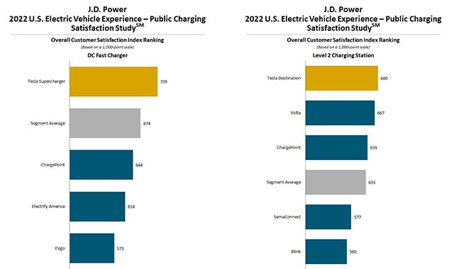 Despite that more public charging stations are in operation than ever before, customer satisfaction with public Level 2 charging declined from last year, dropping to 633 (on a 1,000-point scale) from 643 in 2021, while satisfaction with the speedier DC (direct current) fast charger segment remains flat at 674. This lack of progress points to the need for improvement as EVs gain wider consumer acceptance because the shortage of public charging availability is the number one reason vehicle shoppers reject EVs. Tesla Destination ranks highest among Level 2 charge point operators with a score of 680 and Tesla Supercharger ranks highest among DC fast chargers with a score of 739.