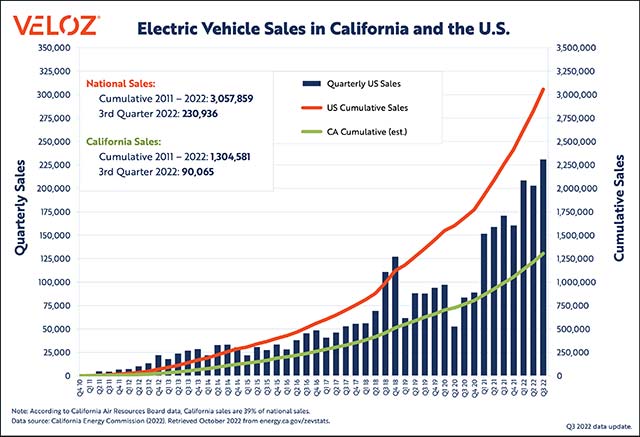 Following second quarter’s slight decrease in California’s EV sales numbers, Q3 of 2022 came back with a vengeance that even surpassed Q1’s record setting sales numbers by nearly 10,000 vehicles, according to tracking by Veloz – a Sacramento-based nonprofit dedicated to growing the adoption and understanding of electric cars by consumers.