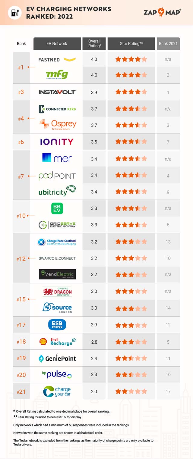 Zap-Map, the UK’s leading charge point mapping service, has released its annual public EV charging network satisfaction rankings, with Fastned and MFG EV Power – two ultra-rapid charging networks providing reliable charging hubs – coming in joint first place.