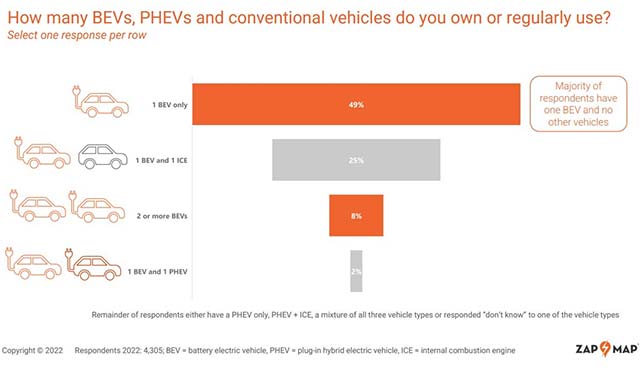 The annual Zap-Map EV Charging Survey showed that most EV owners only own electric. 49% drive just one full battery-electric vehicle, 8% two or more and 2% own or regularly use one battery electric and one plug-in hybrid electric vehicle.