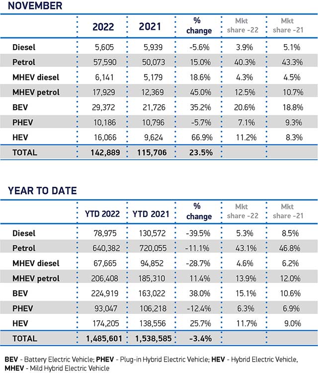 The growth delivered the best total for November since 2019,1 with manufacturers continuing efforts to fulfil orders amid erratic global components supply. However, registrations in the month were still -8.8% below 2019 levels and, while further recovery is anticipated in 2023, global and domestic economic challenges mean that the market will remain below pre-pandemic levels.
