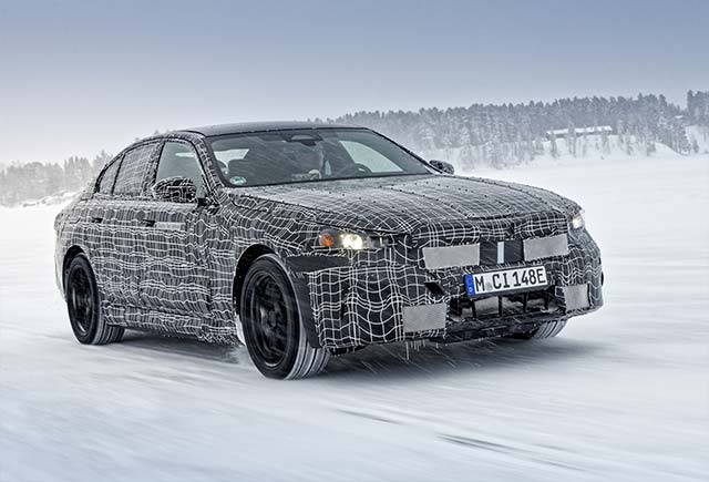As part of the production development process, the new BMW i5 first had to prove its mettle back in February 2022, when it completed a road trip from Munich to the BMW test centre at Arjeplog. A prototype model of the all-electric BMW 5 Series fully camouflaged with a special wrap, plastic attachments, grilles and provisional headlights and rear lights set off on a five-day test drive from the foothills of the Bavarian Alps up to Denmark, then on to the edge of the Arctic Circle in Swedish Lapland.